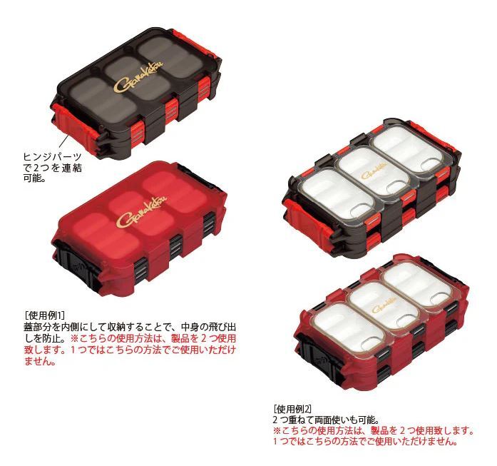 Удобные коробки Gamakatsu GM2484 Quick Case для крючков и рыболовной оснастки из поликарбоната. Застежки сделаны из ABS пластика. Ячейки снабжены силиконовыми уплотнителями. Две коробки можно сложить вместе и зафиксировать (для этого по бокам предусмотрены застежки). При этом можно соединить как окшками ячеек наружу, так и внутрь - это дополнительно предохраняет от рассыпания содержимого при случайном открытии крышки ячейки. Отличаются по количеству отделений в одной ячейке. Каждая коробка разделена на три ячейки, в ячейках по 2 или 3 отделения.