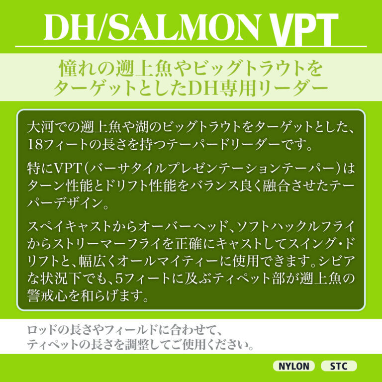 Подлесок DH/SALMON VPT “Versatile Presentation Taper” — это универсальный лидер из серии DH/Salmon. Хорошо сбалансированная конструкция с утяжеленным концом подходит как для забросов Spey, так и для забросов Overhead, а также для широкого диапазона размеров мушек. Поводок VPT повышает точность и обеспечивает плавный контроль при проводке мушек. При необходимости укоротите 1,5-метровый поводок в зависимости от ситуации и размеров снасти.